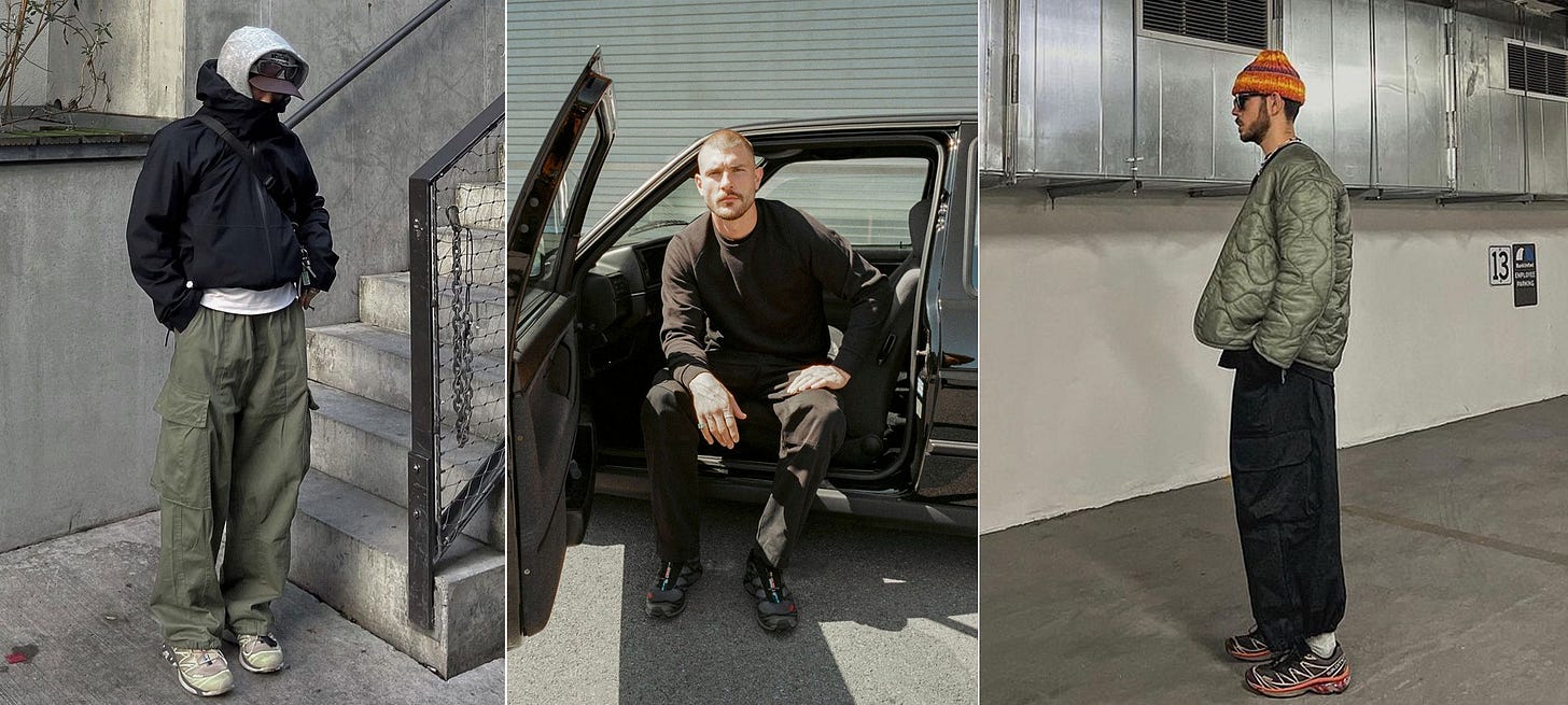 Running shoes have what gym shoes fundamentally lack, versatility. A Salomon XT-6 looks technical to signal performance credibility, but the silhouette works with wide leg trousers, raw denim, and even slightly more formal contexts.